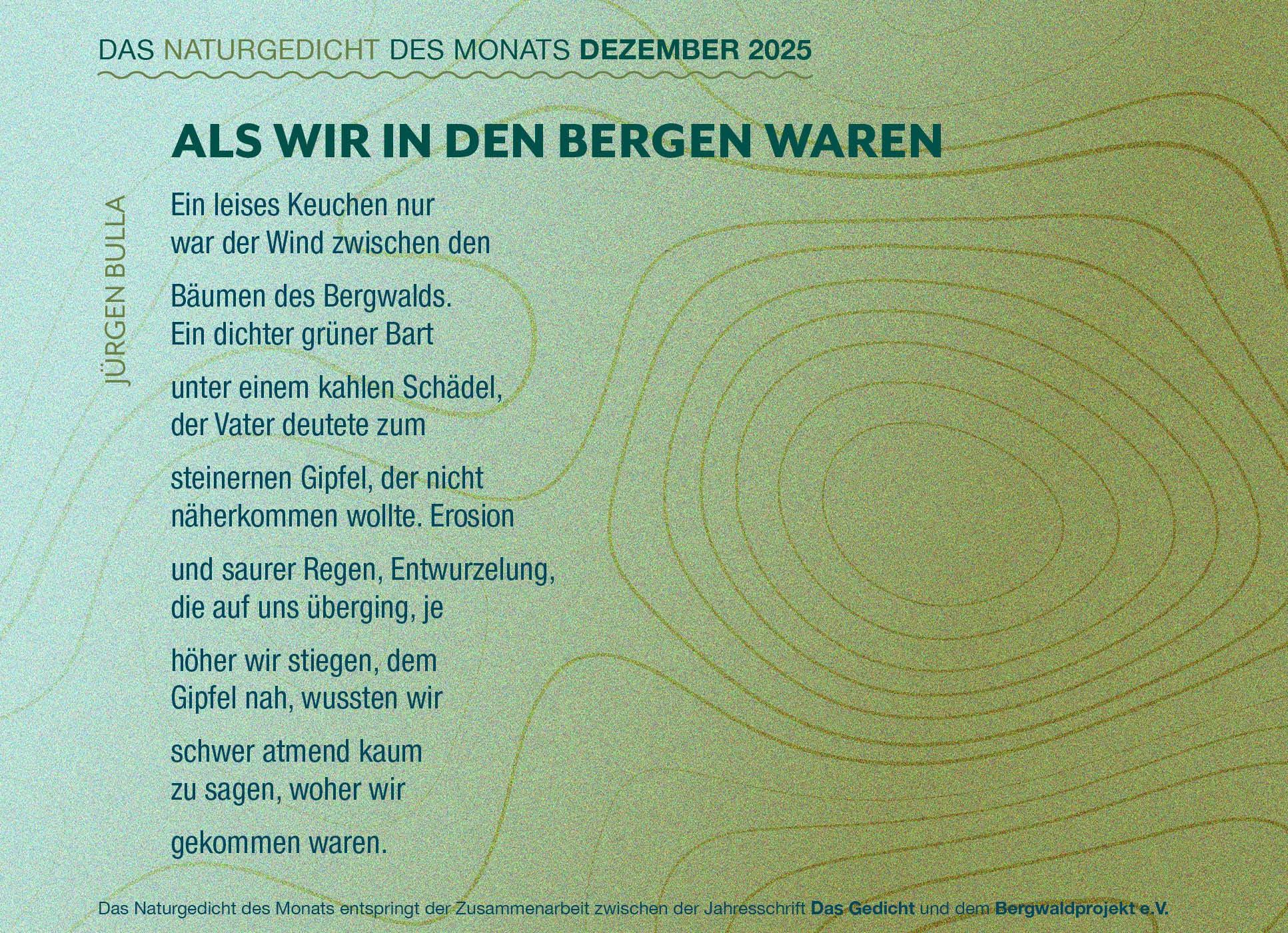 Hintergründe zu dieser Reihe: Der Verein Bergwaldprojekt leistet unter dem Motto »Aufbäumen« seit 1991 tatkräftige Wald- und Naturschutzarbeit in Deutschland. Mittels Öffentlichkeitsarbeit versucht er zudem, Menschen für die Natur und ihre Gefährdungen, die zugleich eine Gefährdung unserer Lebensgrundlage bedeutet, zu sensibilisieren – und dies auch mit Lyrik. In Zusammenarbeit mit DAS GEDICHT publiziert er seit 2020 das »Naturgedicht des Monats«. Eigens gestaltete Gedichttafeln werden hierfür zu Monatsbeginn auf den Social-Media-Kanälen des Bergwaldprojekts (u. a. Facebook, Instagram, Telegram) veröffentlicht.