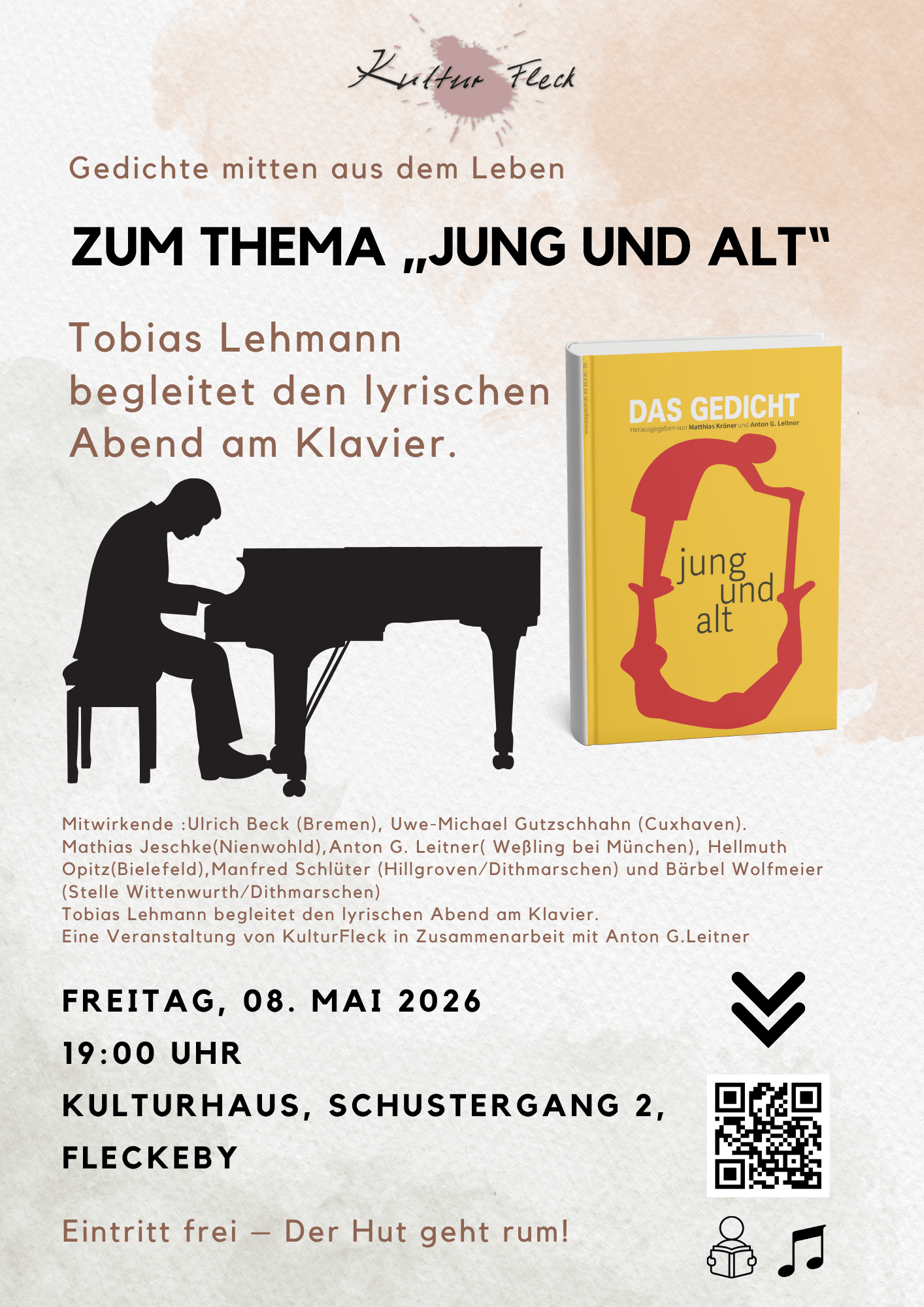 Neue Gedichte mitten aus dem Leben, die die Generationen verbinden, die Jugend und Alter sowie die schnell vergehenden Jahre dazwischen in den lyrischen Blick nehmen: Sie gibt’s zu hören auf der Norddeutschland-Premiere der aktuellen Ausgabe von DAS GEDICHT, also am 8. Mai 2026 ab 19 Uhr im Kulturhaus Fleckeby. In seinem 33. Jahrgang, herausgegeben von Anton G. Leitner zusammen mit Gast-Editor Matthias Kröner, versammelt DAS GEDICHT Lyrik von fast 200 Gegenwartspoetinnen und -poeten zum Thema »jung und alt«. Sieben von ihnen werden am Freitag, 8. Mai 2026, ihre eigenen sowie ihre Lieblingsstücke von Kolleginnen und Kollegen aus dem Band lesen. Los geht’s bei freiem Eintritt um 19 Uhr im Kulturhaus Fleckeby, Veranstalter ist der Kulturförderverein KulturFleck. Die Moderation übernimmt Uwe-Michael Gutzschhahn, der für den Band auch wieder einen Teil mit Gedichten für Kinder zusammengestellt hat und auch selbst liest, neben ihm tragen vor der Stammherausgeber Anton G. Leitner sowie Ulrich Beck, Mathias Jeschke, Hellmuth Opitz, Manfred Schlüter und Bärbel Wolfmeier. Für den musikalischen Rahmen sorgt Tobias Lehmann (Klavier).