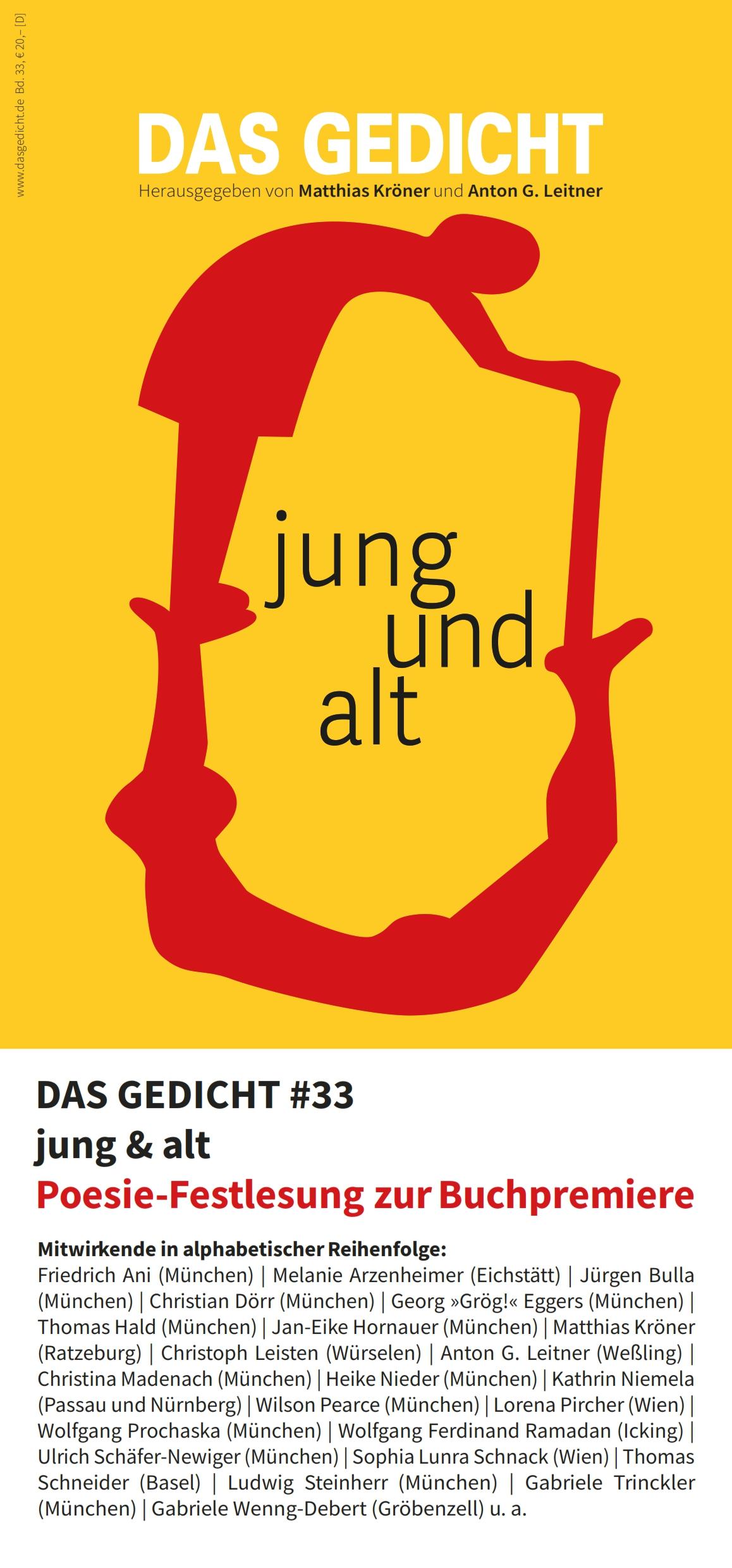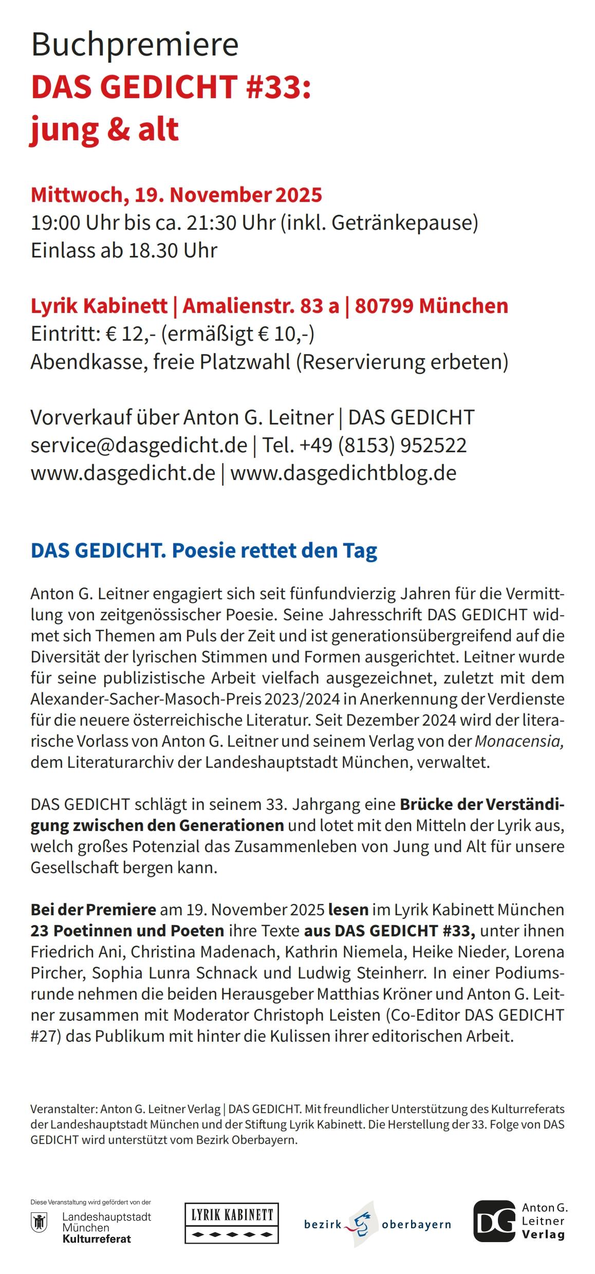 Neue Gedichte von namhaften und aufstrebenden Poetinnen und Poeten zum Thema »jung und alt« haben Stammeditor Anton G. Leitner und sein Co-Herausgeber für die Nummer 33 der buchstarken Jahresschrift DAS GEDICHT zusammengetragen. Unterstützt von 24 Poetinnen und Poeten feiern sie die Buchpremiere am Mittwoch, 19. November 2025, ab 19 Uhr im Münchner Lyrik Kabinett.